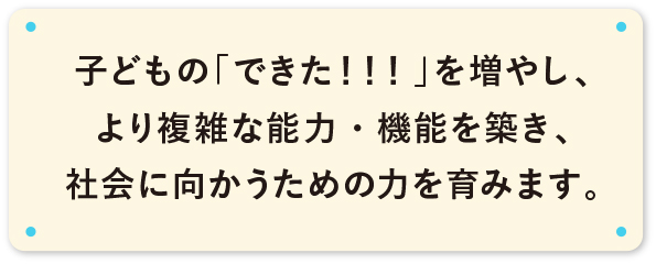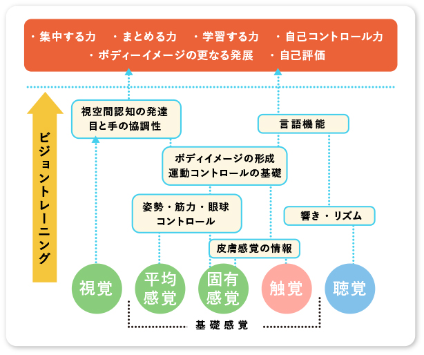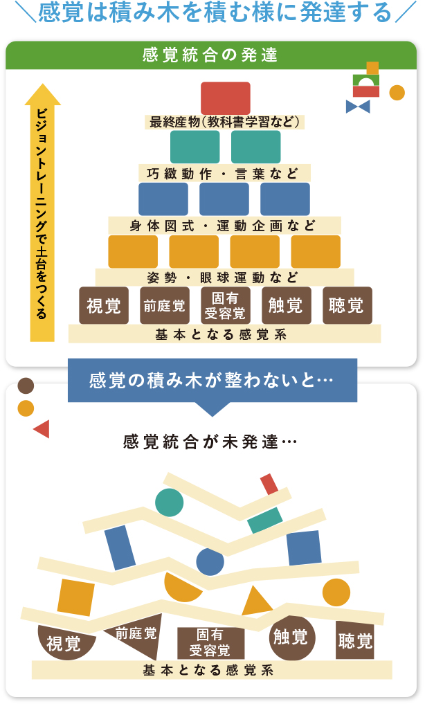全てのベースとなる部分の積み木をしっかり見直し、順番に、備わっている力をつないでいくことが、感覚を安定・統合させ、学習や運動に向かうための土台を作ります。